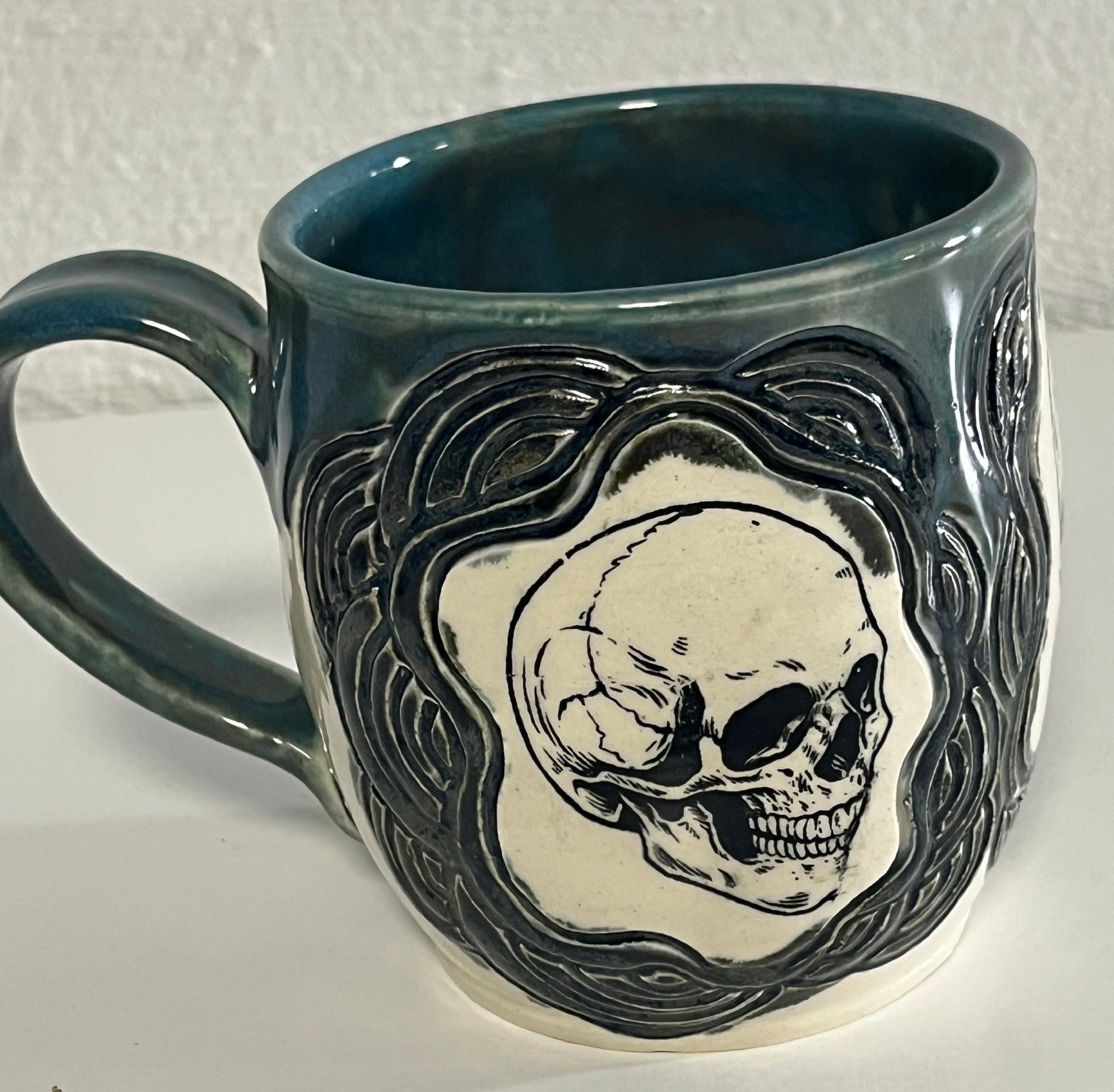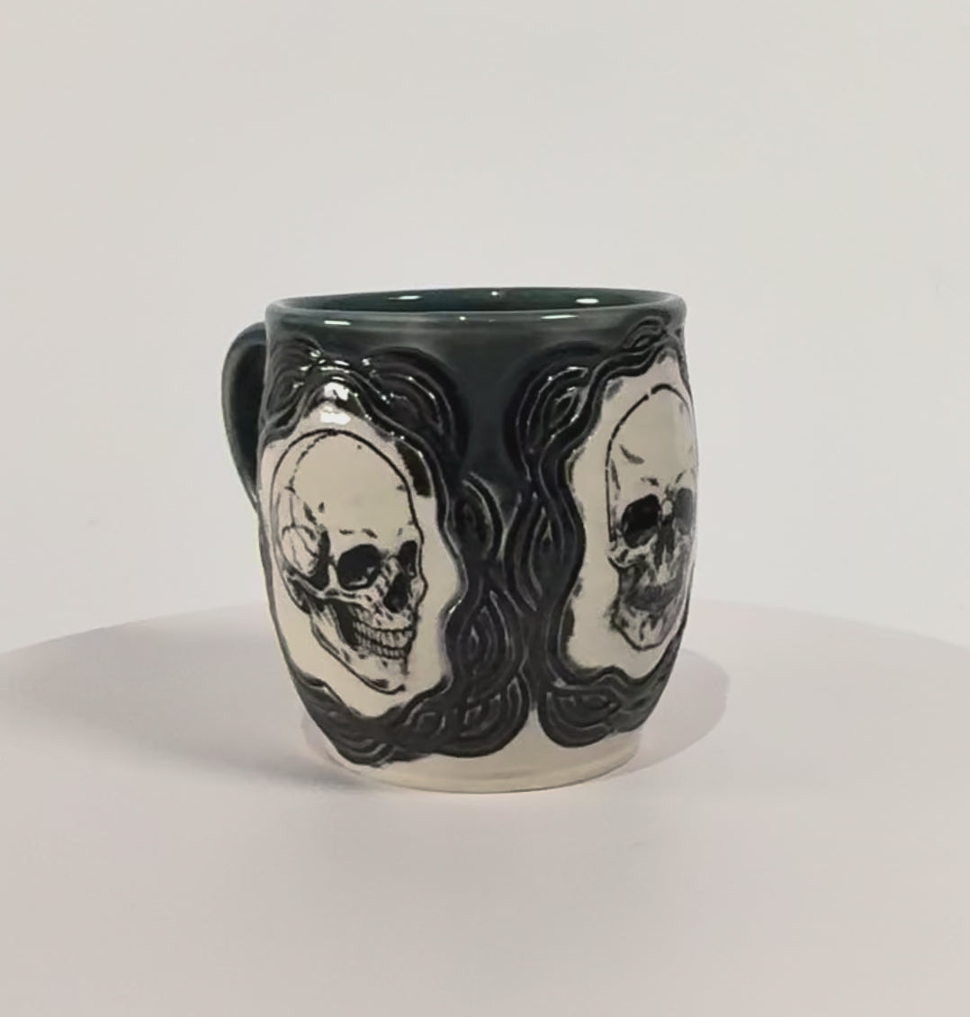 Cone 6 white stoneware with underglaze transfers and green, clear and black glazes 3 5/8” w x 4 1/8 ”h