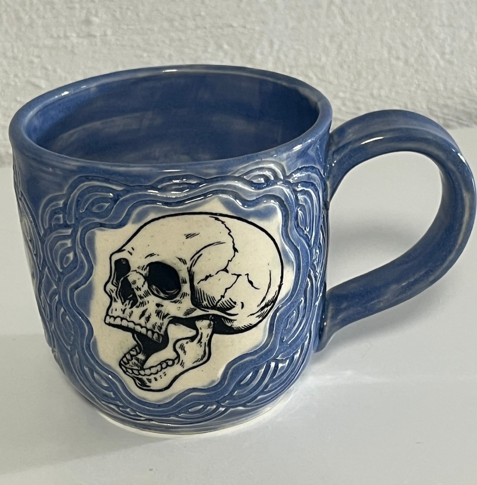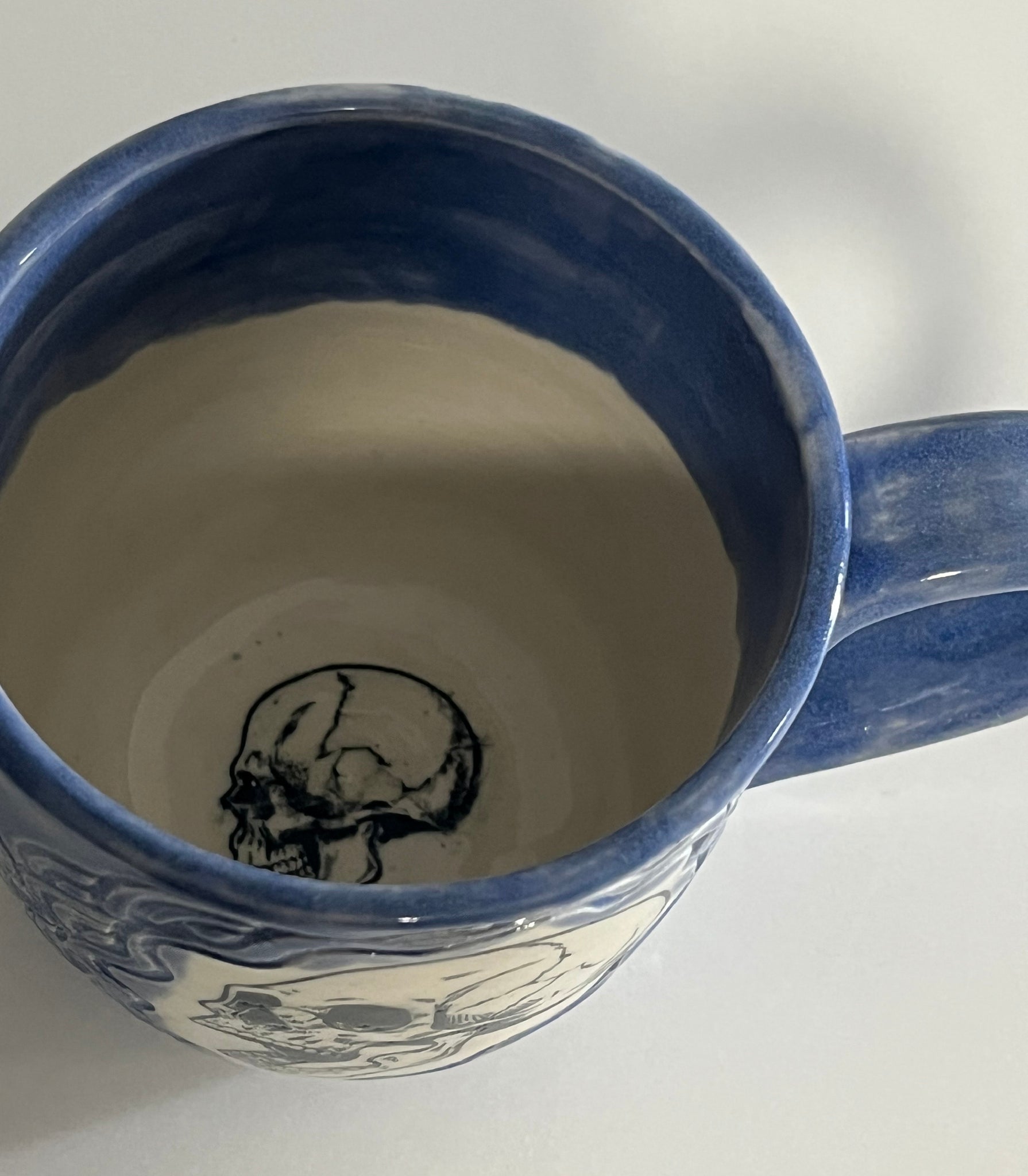 Cone 6 white stoneware with underglaze transfers and blue, and clear glazes 3 1/2 ” w x 3 5/8 ” h
