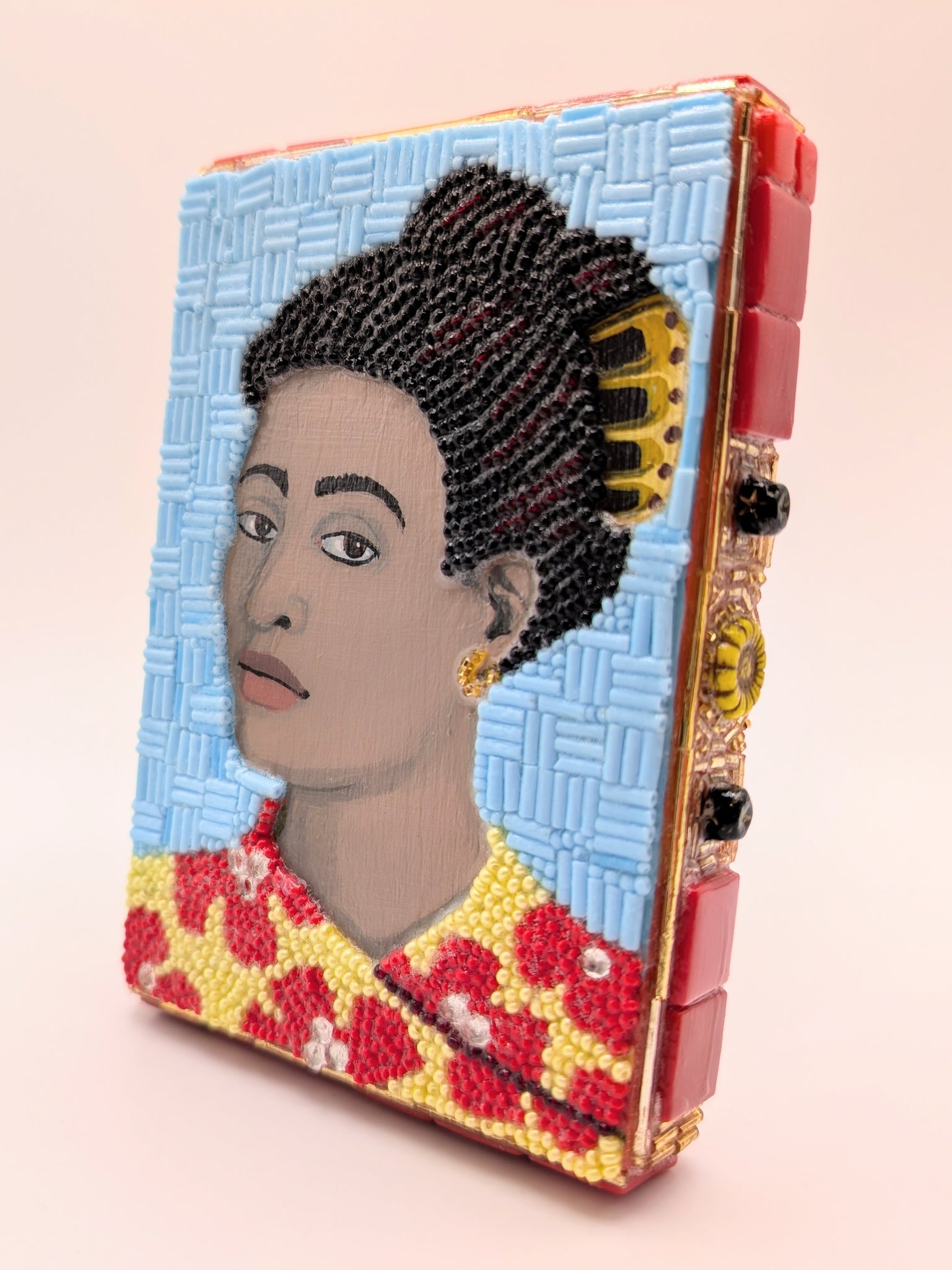 Acrylic paint, varnish, glass beads, glass cabochons, glass tiles, brass and glue, on wood. Wire-wrapped copper loop on back for hanging.