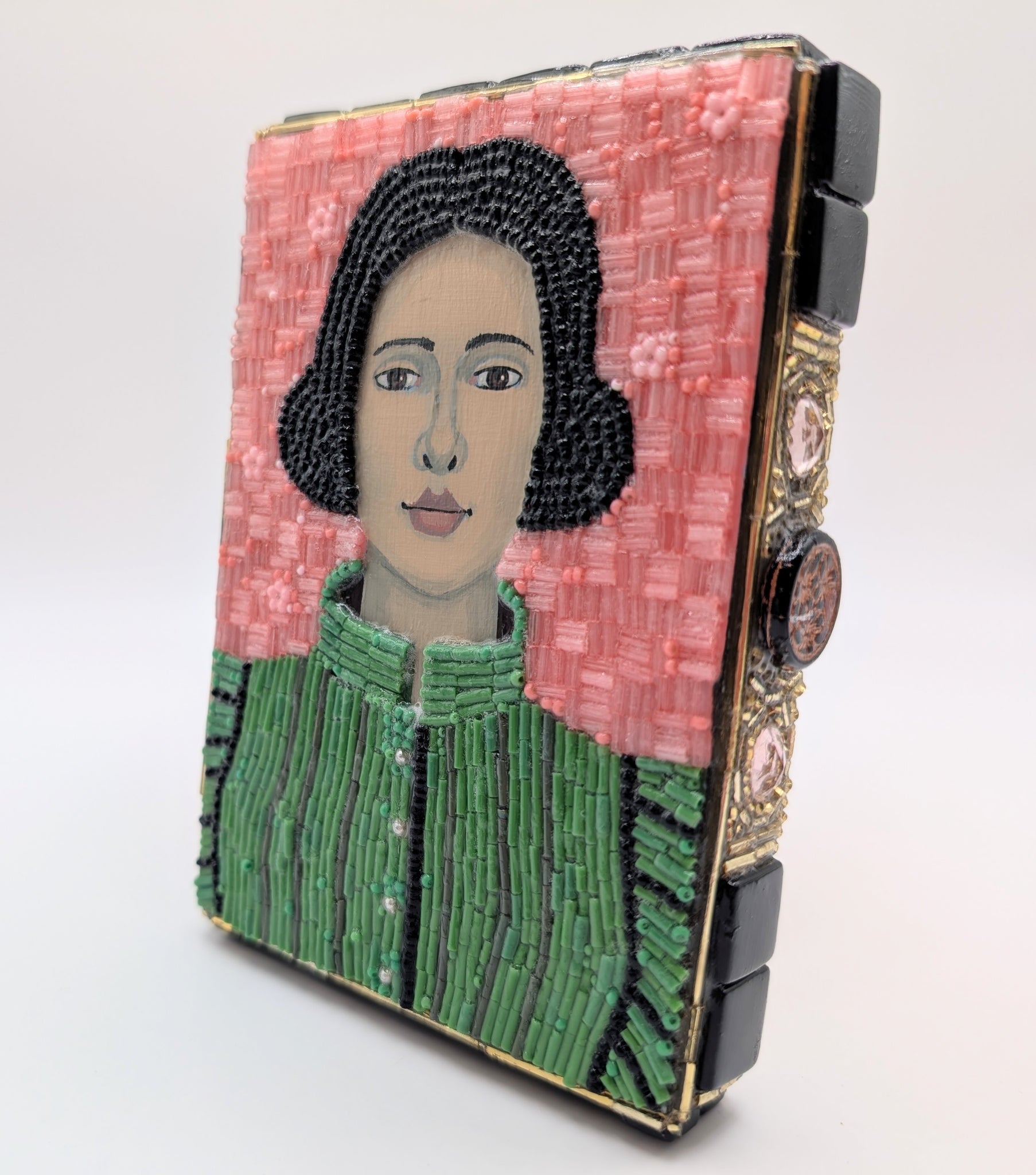 Acrylic paint, varnish, glass beads, glass cabochons, glass tiles, brass, and glue, on wood. Wire wrapped copper loop on back for hanging.