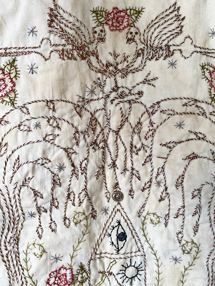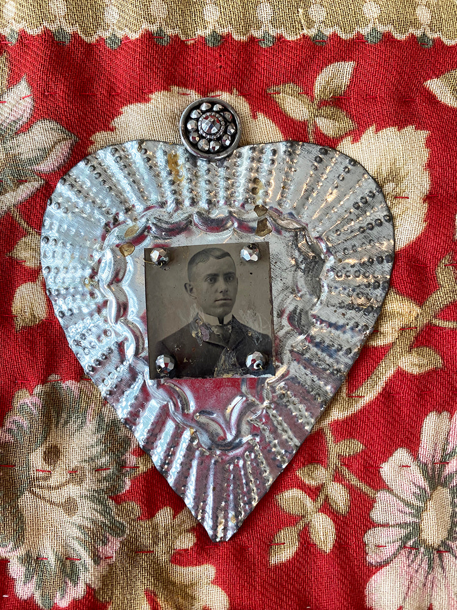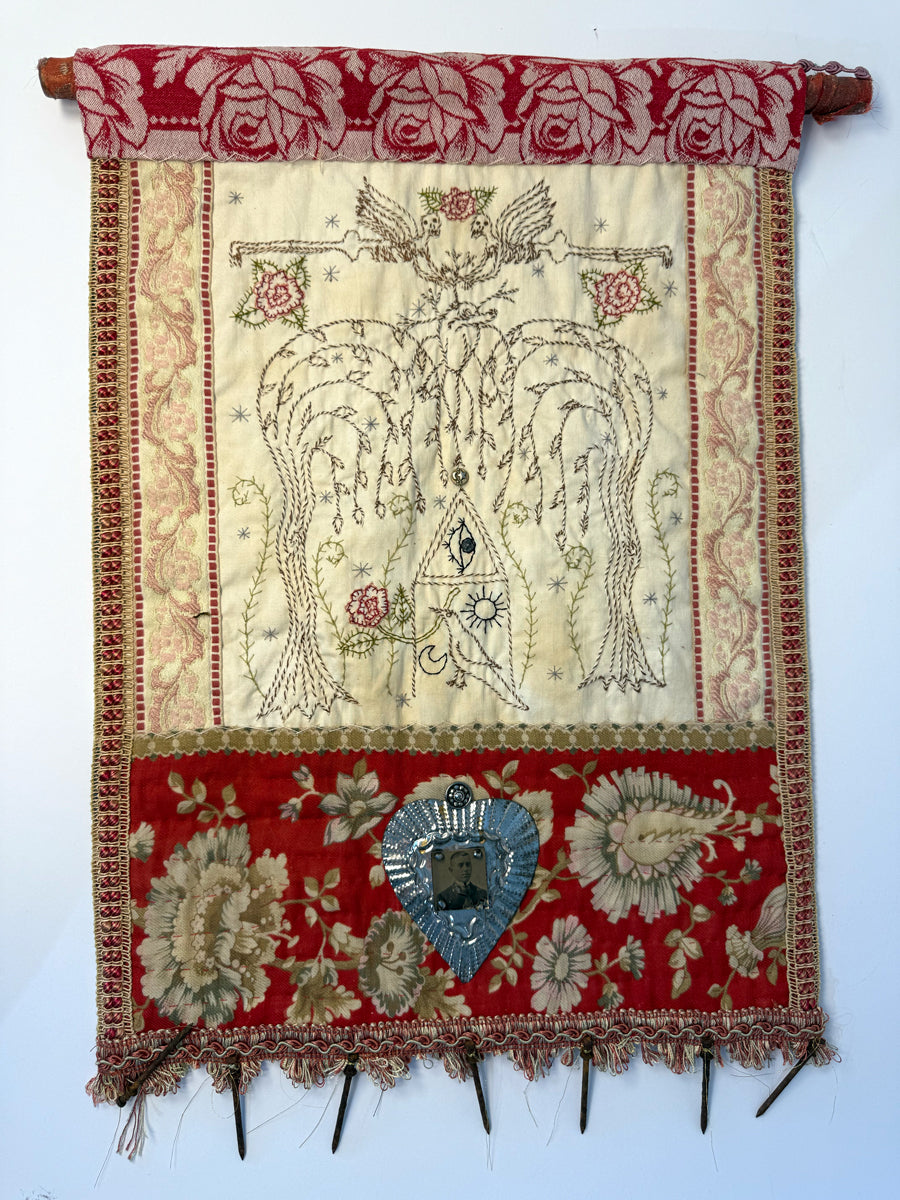Hand embroidered on vintage linen, circa late 1800's English floral Chintz, Milagros and antique tintype 15x22"